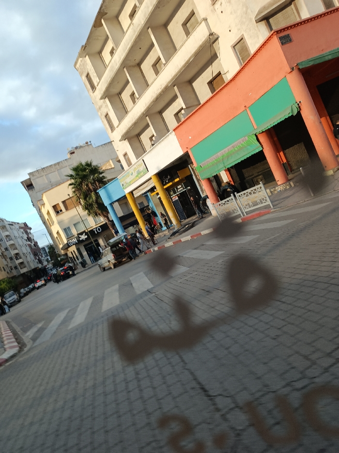 The image depicts an angled street-level view of an urban environment in Unknown, Unknown, under a partially cloudy sky. The scene is dominated by multi-story buildings lining both sides of the street. On the right, a prominent light-colored building features multiple tiers of recessed square window or balcony openings. Its ground floor houses several commercial establishments; one section displays an orange facade with a green awning and a white decorative metal fence below, while adjacent sections feature white, light blue, and yellow storefronts with canopies. On the left side of the street, a multi-story building is partially obscured by a tall palm tree, with additional buildings visible further into the background. The street is paved with grey interlocking pavers and includes white pedestrian crosswalk markings and red-and-white painted curbs. Multiple individuals are visible walking on the sidewalks and congregating near the commercial storefronts. A light-colored, small utility vehicle or truck is present on the street towards the center-left, with other vehicles parked or moving in the distance. Blurred, dark brown shapes, resembling stylized text or symbols, are overlaid or reflected on the street surface in the immediate foreground.