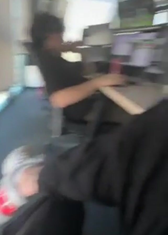 A person is sitting in an office chair, holding a football in their lap. They are wearing black pants and white sneakers with a red stripe. Another person is sitting in a chair behind them, wearing a black shirt and headphones. There are several computer monitors in the background, displaying various images and data. The office has large windows with blinds, and the floor is covered in gray carpet.