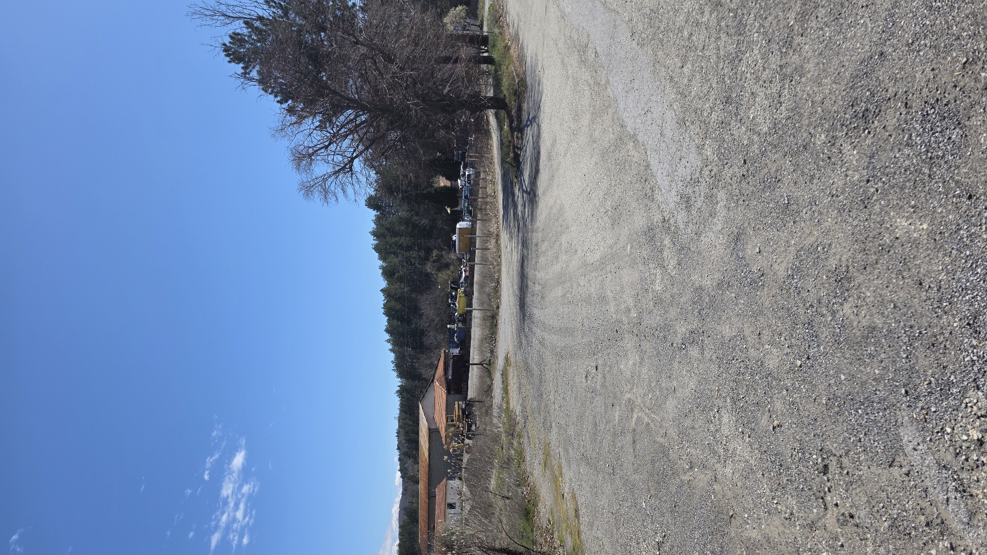 gravel road located in Slatino, Bulgaria, running parallel to a row of buildings and a line of trees