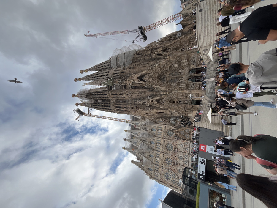 The image depicts an exterior view of the Sagrada Família basilica in Barcelona, Spain, under a partially cloudy sky