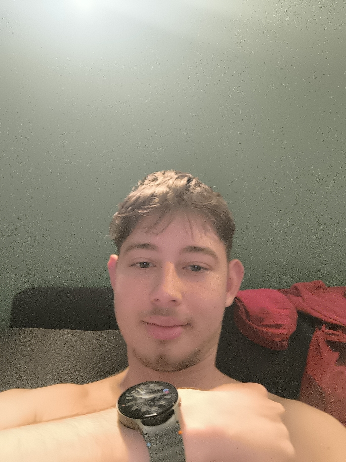 A young male, appearing to be in his late teens or early twenties, is depicted in an indoor setting in Sofia, Bulgaria. He has light skin, short brown hair, and light facial stubble, and is looking directly at the camera with a slight smile. He appears to be shirtless, with his left arm raised to display a dark-faced wristwatch featuring a textured, possibly metallic, gray band. Behind him, a dark-colored sofa or chair is visible, upon which a pile of crumpled red fabric rests to the right of the frame. The background wall is a solid, muted greenish-blue color, illuminated by an unseen light source.