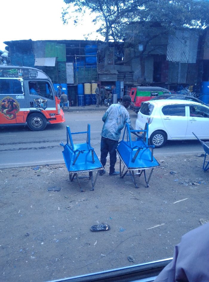 This image depicts a bustling street scene in an urban area within the city of Unknown, Unknown. In the immediate foreground, a dirt and gravel patch features a black flip-flop lying on the ground. A male individual, wearing a light-colored, paint-splattered long-sleeved shirt and dark pants, is positioned centrally, facing away from the viewer. He is actively working on or inspecting two inverted, newly constructed blue wheelbarrows, which occupy the prominent foreground space. Another blue wheelbarrow is partially visible to the far right. Behind this individual and the wheelbarrows, a paved road stretches across the midground. A grey and orange passenger van, commonly known as a matatu, with elaborate black and white decals and "SMU 191" visible on its side, is parked on the left side of the road. Further right, a white hatchback car and a red and green tuk-tuk are present, suggesting traffic or parked vehicles. The background consists of a row of multi-story structures constructed from various materials, predominantly corrugated metal sheets of different colors (blue, green, grey) and some wood. Numerous industrial barrels and drums, primarily blue and yellow, are stacked outside these buildings, indicating a commercial or storage area. Several individuals are visible on the sidewalk in front of these structures, some standing and others possibly seated, near the barrels. A large tree with leafy branches extends over the background buildings. The sky is overcast, and the overall lighting is diffuse. A person's arm and shoulder, wearing a light-colored garment, are visible in the bottom right corner, suggesting the photo was taken from within a vehicle or another structure.