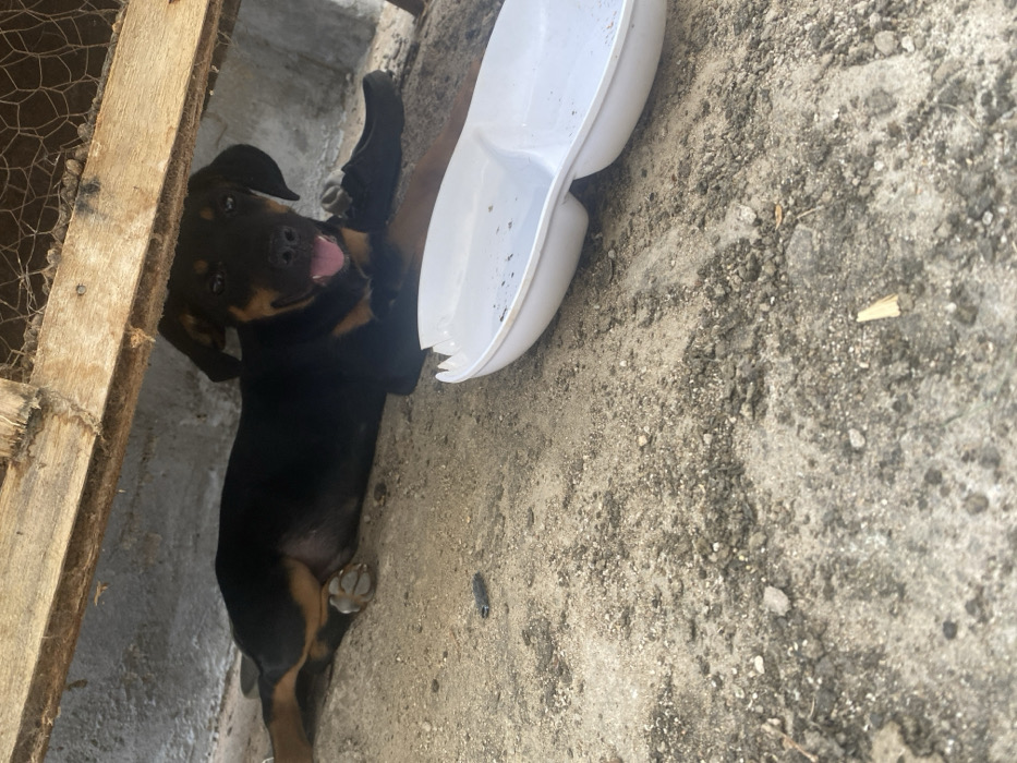 A dachshund puppy lies on its back on a concrete surface, exposing its belly. The puppy is predominantly black with tan points on its legs and face. It is positioned next to a damaged white plastic dish. The puppy’s tongue is sticking out, suggesting it may be panting or playful. The background includes a wooden structure with wire mesh and a concrete wall.