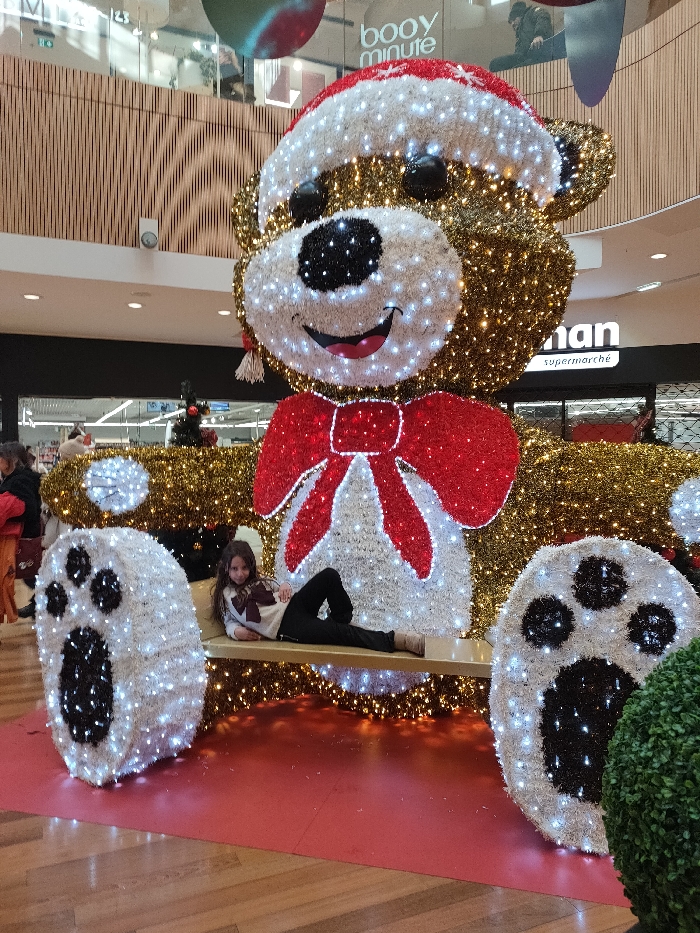 The image displays an indoor scene within a shopping mall, identified as a location in Strasbourg, France, based on the presence of an "Auchan supermarché" sign and the prompt's context. The central subject is a very large, illuminated Christmas-themed teddy bear display. The bear is constructed from numerous small lights: gold lights for its body, white lights for its face, the trim of its Santa hat, and its paws, and red lights for its Santa hat and a prominent bow tie. The bear's face features black eyes, a black nose, and a smiling black mouth. It is depicted in a seated position, with two separate, illuminated white paw structures, each with black paw pads, positioned on either side to form part of a bench. A young girl with long dark hair is lying on this golden bench, positioned between the bear's main body and its right paw (viewer's left). She is wearing a light-colored long-sleeved top with a dark pattern, dark trousers, and light-colored shoes. She is looking directly towards the viewer with a neutral expression. The environment features a polished wood-patterned floor partially covered by a red mat beneath the display. In the background, other shoppers are visible, blurred. Storefronts with signage, including "booy minute" and "Auchan supermarché," indicate a commercial retail setting. Architectural elements such as vertical wooden slat paneling and glass railings are visible on an upper level. A small, sparse Christmas tree stands behind the bear's left side. A spherical green topiary or bush is partially visible in the bottom right corner of the frame.
