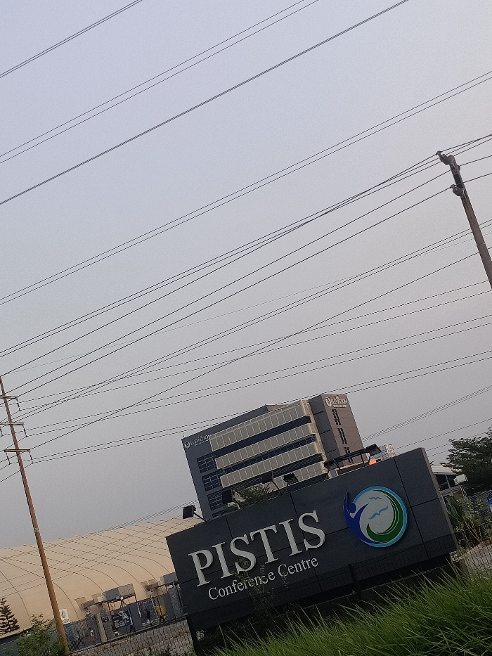 Pistis Conference Centre sign in front of a modern building. Overhead, a network of electrical wires crisscrosses the sky, connecting to utility poles. The sky is overcast, providing soft, diffused lighting. Greenery surrounds the base of the sign and a partial view of a large, tent-like structure is visible in the background, hinting at event space.