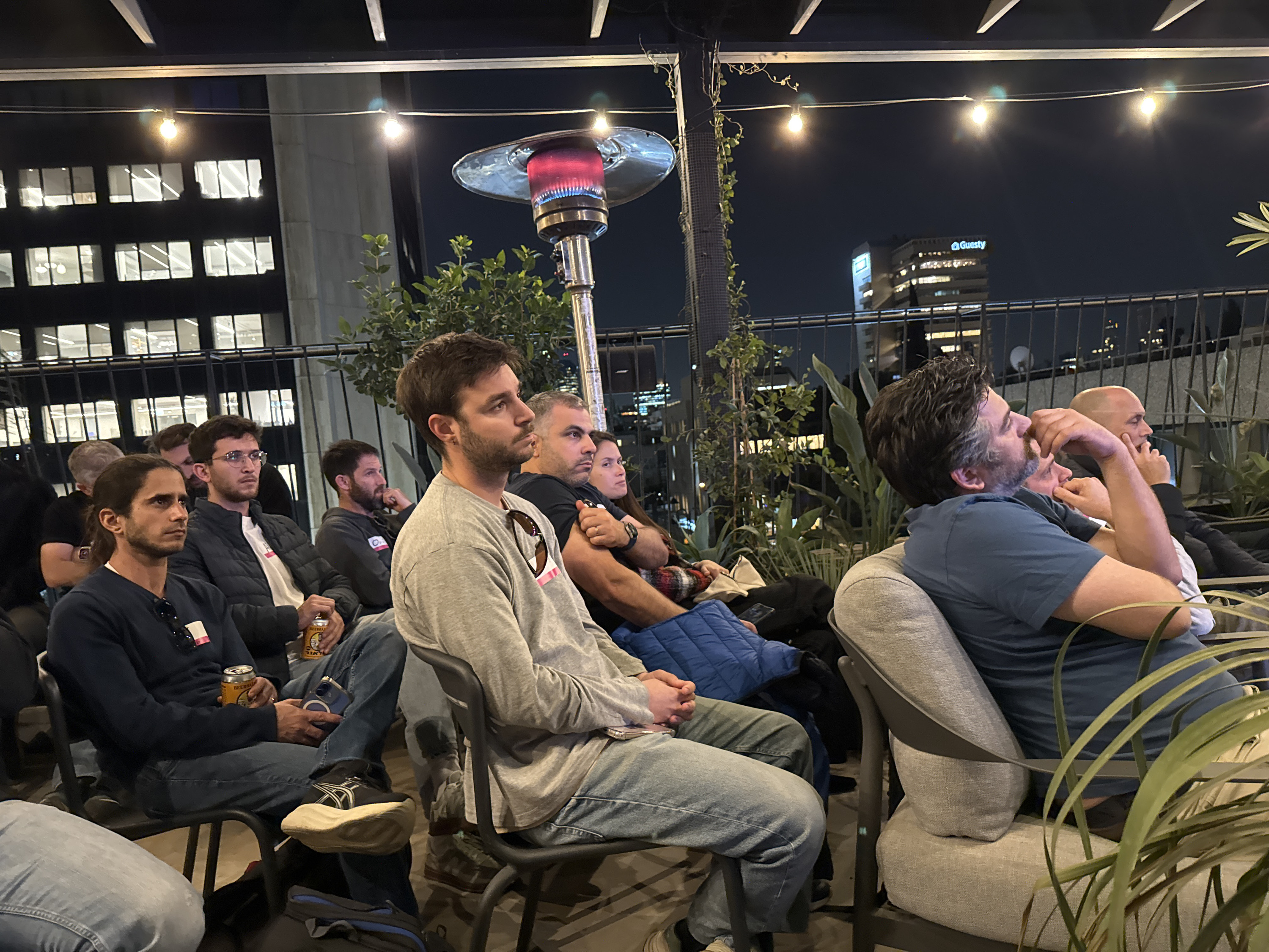 A group of men are seated in chairs outdoors at night, seemingly watching something. A patio heater is visible behind the men. Buildings with illuminated windows are visible in the background behind a dark railing. A string of lights hangs overhead. Some of the men are holding beverages. The men appear to be focused and engaged.