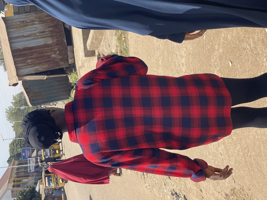 An outdoor street scene in Chikaji, Nigeria, is depicted under clear, bright skies. In the immediate foreground, a person is shown from the back, wearing an oversized red and black plaid long-sleeved shirt, black leggings, and a black head covering. The left sleeve cuff is partially rolled, and the left hand is visible. To the right, the side of another individual in a dark navy full-length garment is partially visible. Both stand on an unpaved, light brown ground. In the mid-ground, moving left to right, a person in a flowing red garment walks away from the viewer on the unpaved surface. Further down the road, two yellow tricycles (keke Napeps) are present, one partially obscured and displaying "OLD" on its side. To the right, two dilapidated structures made of rusted corrugated metal sheets sit on an elevated, overgrown patch of ground, supported by visible concrete blocks. The background features multi-story buildings, some with balconies and arched windows. Signage, including "DANGOTE CEMENT" and "KUF FOAM," is visible on a building facade. Utility poles and overhead lines intersect the sky.