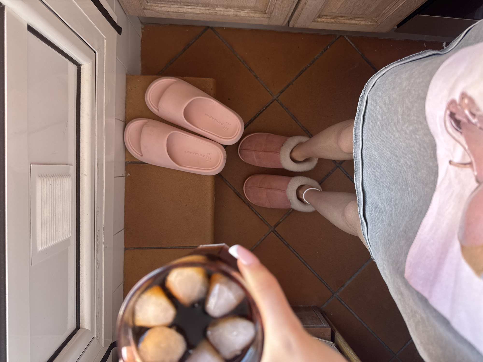 An overhead photograph depicts an indoor scene in L'hospitalet De Llobregat, Spain, focusing on an individual's lower body and arm. A left hand, displaying manicured nails with French tips, holds a clear glass containing a dark liquid and approximately eight ice cubes. The individual's bare legs are visible, terminating in pink, fur-lined slippers. A white beaded anklet adorns the right ankle. The subject wears grey shorts or a skirt over a light-colored top with a partial graphic design. On the terracotta-tiled floor, positioned on a slightly raised threshold near a white door frame, rests a pair of unworn light pink "PRIMARK" brand slide slippers. The floor consists of square terracotta tiles with dark grout lines. A section of light brown wooden cabinetry is visible along the right edge of the frame. The white door frame at the top includes a rectangular vent feature.