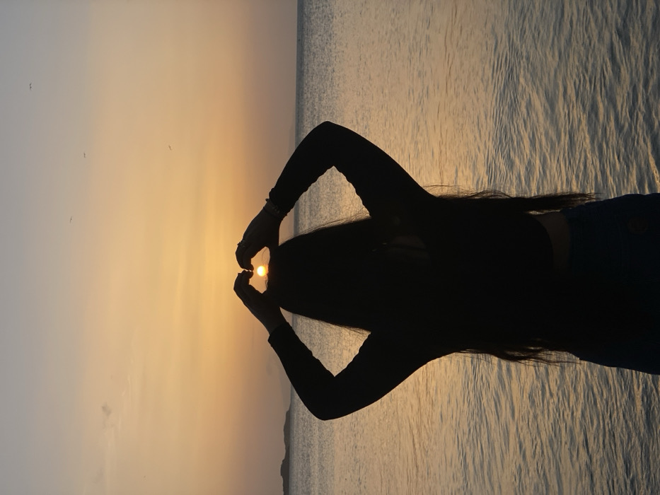 A silhouetted individual, viewed from behind, stands facing a body of water during sunset in Juan Griego, Venezuela. The individual possesses long, dark hair and wears dark clothing. Both arms are raised above the head, with hands joined to form a heart shape that frames the setting sun. The sun, a bright orange orb, is centered within this heart. The sky above displays a gradient of orange and yellow hues, with several small, dark bird silhouettes visible in the upper atmosphere. The water surface below reflects the sunset colors, showing subtle ripples, and a faint, dark landmass is visible on the distant horizon to the left.