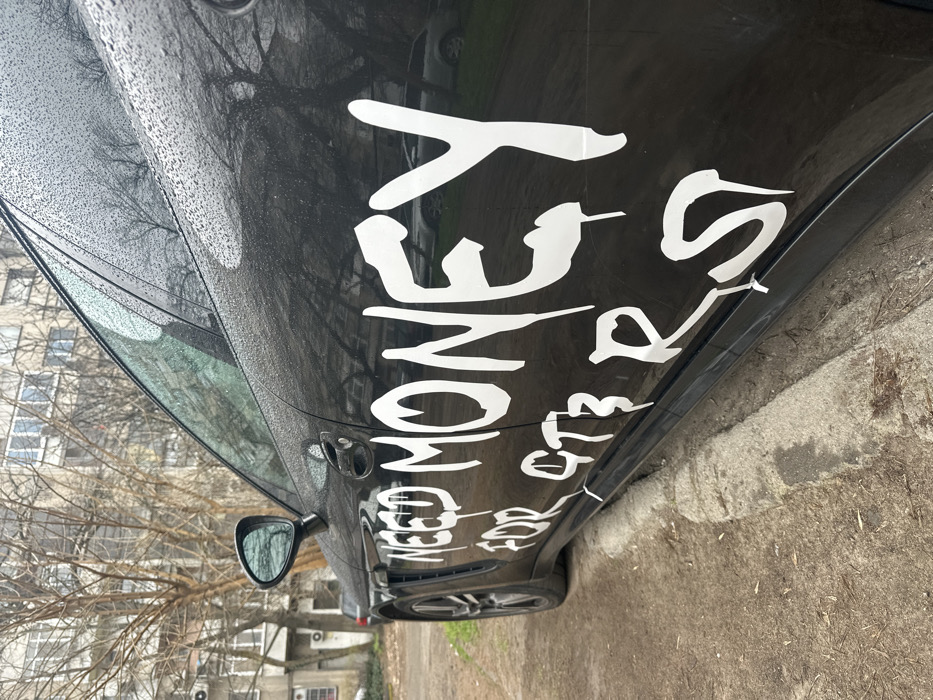 A black Porsche Panamera is parked on an unpaved dirt verge next to a weathered concrete curb in Plovdiv, Bulgaria. The driver's side of the vehicle is adorned with large, white, vinyl decal lettering in a graffiti style, which reads "NEED MONEY FOR GT3 RS." The text exhibits simulated drips, creating the impression of wet paint. The car's exterior surface is covered in visible water droplets. In the background, leafless deciduous trees stand before a multi-story concrete residential building, characteristic of urban architecture in the region. No individuals are present within the frame.