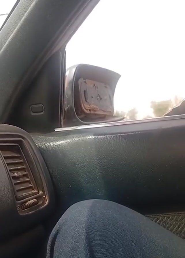 interior of a car, focusing on the front passenger side. The car's interior is dark green and shows signs of wear. The side mirror is broken, with only the base remaining attached to the car. Outside the window, the landscape is dusty and sparse, with trees and a bright, hazy sky. A person wearing dark blue pants is sitting in the passenger seat, their leg visible in the lower portion of the frame. The video is taken from an interior perspective while the car appears to be moving.