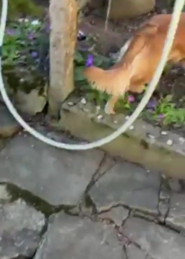 A brown dog walks across cracked stone pavers, then onto a raised stone planting bed with some purple flowers