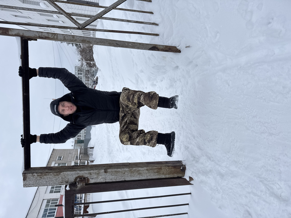 A young adult male is depicted hanging from a rusty, snow-covered horizontal metal bar, which is part of an open, corroded metal gate structure. He wears a black hooded puffer jacket, black gloves, camouflage-patterned trousers, and black winter boots. A black beanie with a white "GEORGIN" logo is visible under his hood. His arms are bent, and his legs are drawn upwards, with his feet suspended above the deep snow that covers the ground. He gazes directly towards the viewer with a neutral expression. The environment is a winter scene with an overcast sky. In the background, to the left, stands a light-colored, multi-story building with numerous windows, and to the right, another similar multi-story building is visible. The ground between the gate and buildings is entirely covered in untouched snow, except for a cleared path directly beneath the subject. This scene is located in the city of Chaikovsky, Russia.