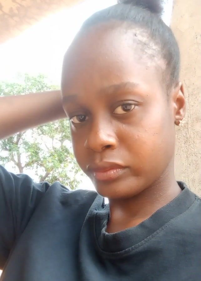 A young, dark-skinned woman is posing for a selfie outdoors. She is wearing a black t-shirt and has her hair pulled back in a bun. She is holding her right hand behind her neck. She has a serious expression on her face, looking down. Behind her, there is a wall and a tree is visible in the background. The lighting appears to be daylight.