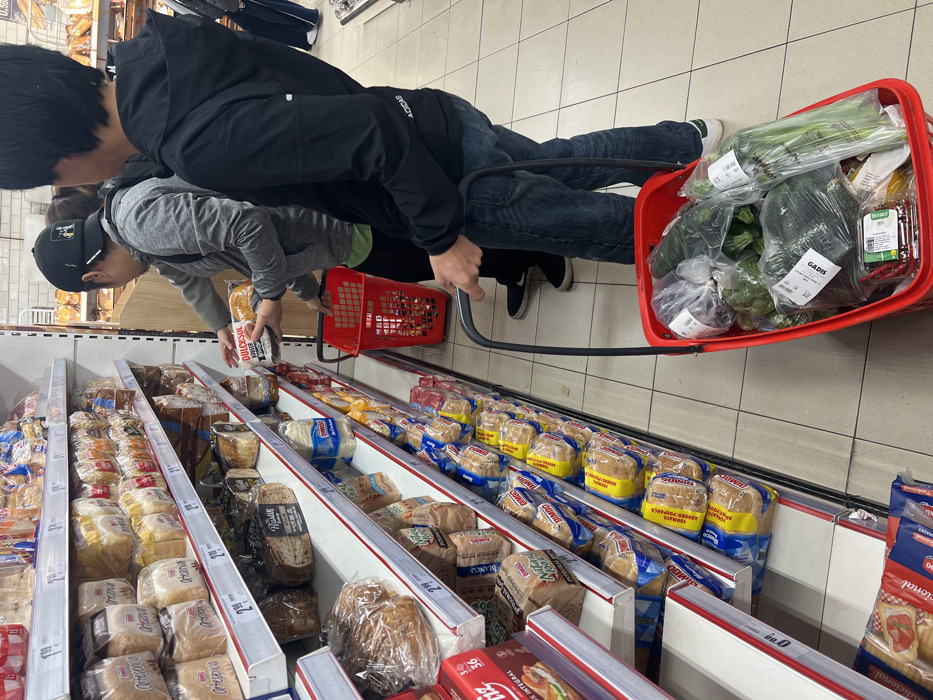 The image depicts an indoor supermarket aisle, specifically a bread section, likely a GADIS supermarket in A Coruña, Spain, indicated by a "GADIS" label on a product in a shopping basket