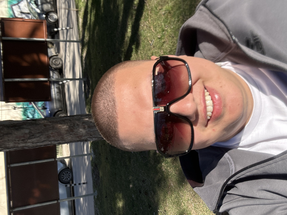 A male individual with a buzz cut hairstyle and fair complexion is depicted in a close-up, smiling self-portrait