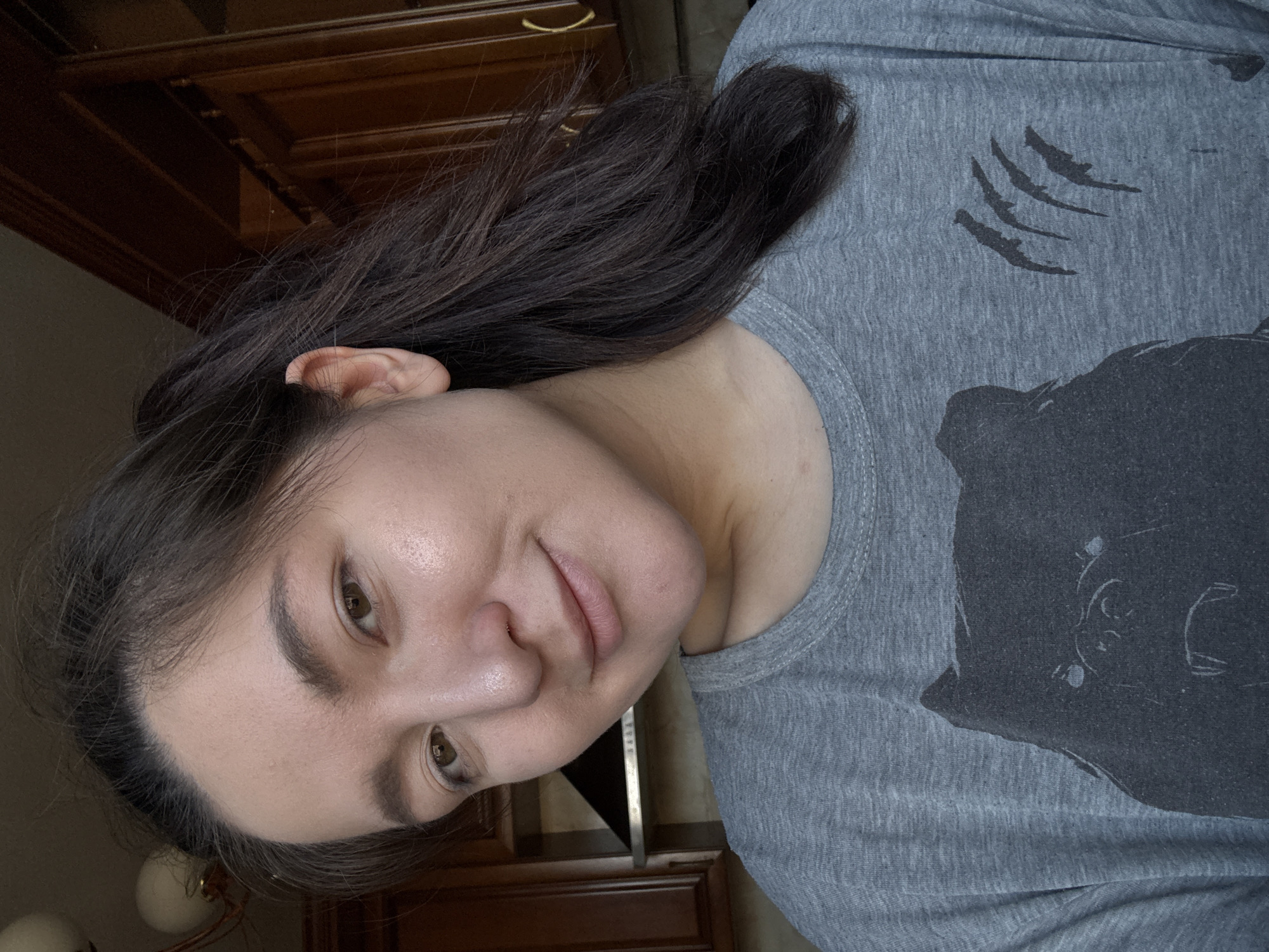 An image taken in Kurovskoye, Russia, depicts a female subject from the chest up, positioned centrally and facing the viewer. She has fair skin, brown eyes, and dark brown hair, which appears to be pulled back, with some loose strands visible around her face. Her lips are light-colored, and she displays a slight, closed-mouth smile. She is wearing a light grey t-shirt featuring a dark grey graphic print on the front. The print includes the head of a bear on the left side and three distinct claw mark graphics on the right side. The background indicates an indoor setting, likely a kitchen. Dark brown wooden cabinetry with gold-colored handles is visible on both sides of the subject. A white, spherical light fixture is partially visible on the upper left. Below the upper cabinets, a dark metal range hood or exhaust vent is present, with a silver-colored trim or shelf underneath it. The lighting is even, illuminating the subject's face and the immediate background.