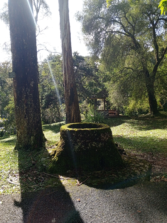 A sunlit clearing reveals a moss-covered tree stump with a hollowed-out top. Behind the stump, two tall trees stand, one with peeling bark. A shaded gazebo with a bench is visible in the background, nestled among lush greenery. The ground is covered in grass, leaves, and a paved walkway in the foreground. A strong shadow from a tree falls across the walkway.
