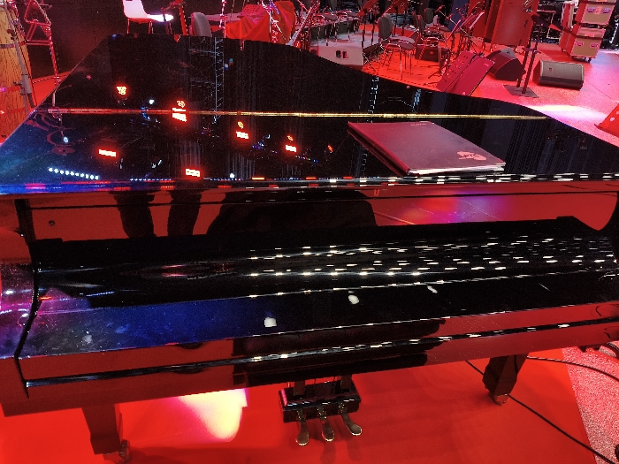 - "The image presents a close-up, low-angle view of a highly reflective black grand piano situated on a red stage carpet" by FM-JJ59A2, licensed under CC BY 4.0