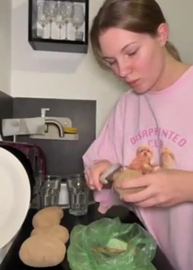 A woman with light skin and light brown hair is standing in a kitchen and peeling a potato