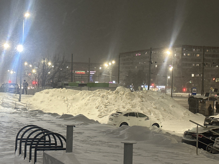 A winter street scene at night with heavy snowfall. Streetlights illuminate the scene, casting light on the snow-covered ground and buildings. A large pile of snow dominates the foreground, with a white car partially buried within. A bicycle rack is visible on the left. Buildings, a bus stop, and other parked cars are visible in the background. The sky is overcast with falling snow creating a blurry and wintry atmosphere.