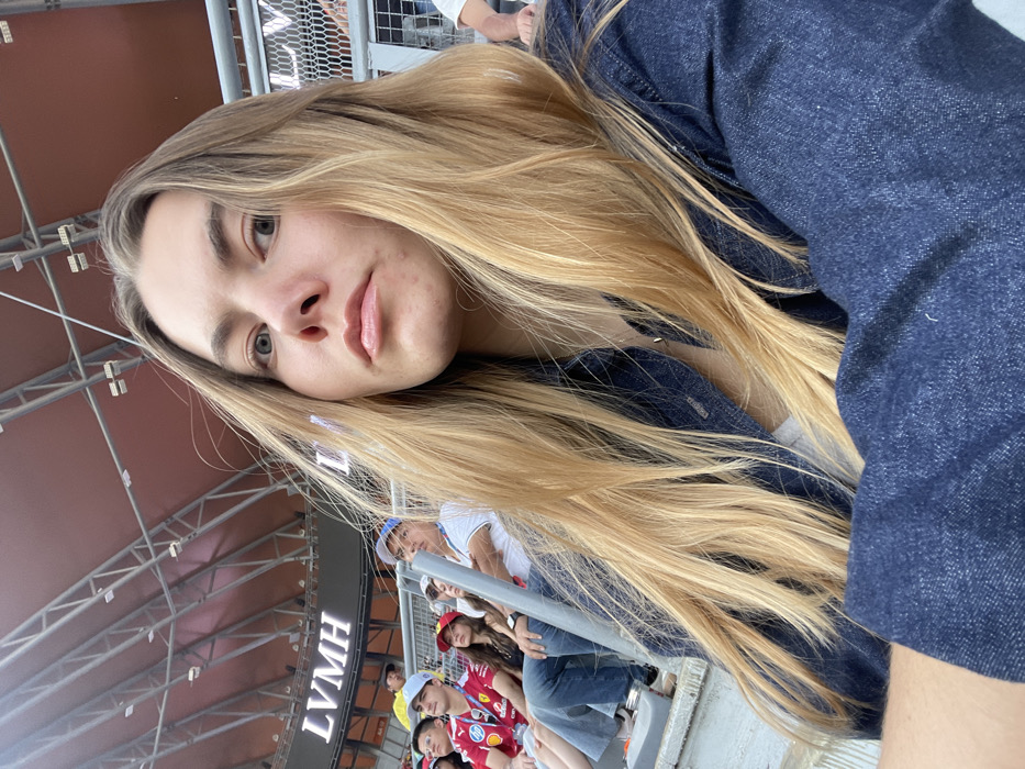 - "A close-up photograph centers on a young adult female with long blonde hair and a neutral expression, wearing a dark blue denim jacket over a light-colored top" by FM-acnJb2, licensed under CC BY 4.0