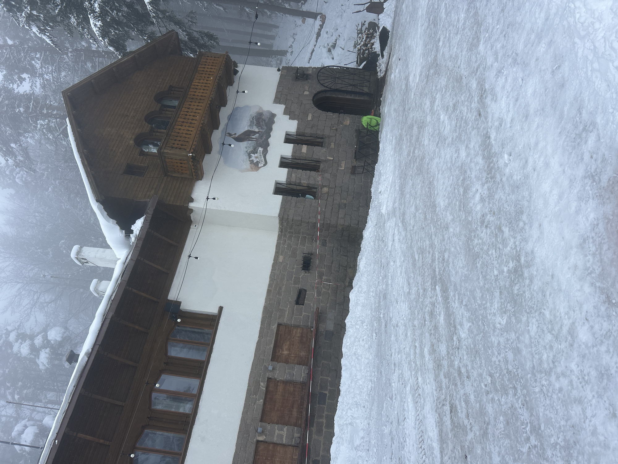 The image depicts a multi-story building in a snowy environment, likely in a mountainous region. The building has a distinct architectural style, combining wooden elements (dark brown window frames, balcony railings, and gable) with stone and whitewashed walls. On the upper part of the building, there's a mural depicting an animal, possibly a deer or ibex. Some snow covers the roof. The area surrounding the building is covered in snow. The ground is icy or snow-covered. Trees are visible in the background, partially obscured by fog or mist, suggesting a high-altitude location. The location appears to be in or near a forest, and the architectural style suggests a location in the Balkans or Central Europe. While it's difficult to confirm with certainty, the architectural style and snowy mountain setting make it plausible that this could be the Hotel Moreni, located near Sofia, Bulgaria. Further evidence, such as the mural or the specific construction details, would be needed to confirm this definitively.