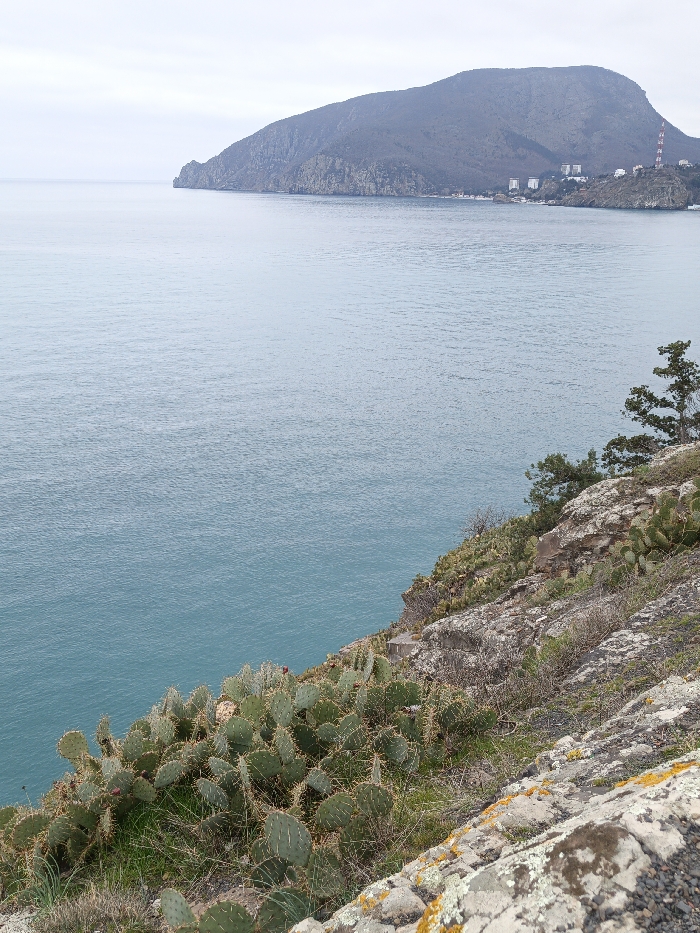 The image displays a coastal landscape in Utios, Ukraine, under an overcast sky. In the immediate foreground on the right, a steep, rocky incline is visible, densely populated by green Opuntia (prickly pear cactus) patches, some bearing reddish fruits. The rocks are grey and exhibit patches of yellow and white lichen. Further up the slope, a small, dark green coniferous tree is situated, and a partial view of a small, square, concrete-like structure is discernible amongst the rocks. The midground is dominated by a wide expanse of calm, turquoise-blue water with subtle surface ripples. In the background, a prominent, large, dark grey, rounded mountain or headland, identified as Mount Ayudag, extends into the sea. Along the base of this mountain, several white buildings indicate a human settlement. A tall, red and white striped telecommunication tower stands on a smaller elevated section of the distant coastline, to the right of the mountain's base. The sky is a uniform light grey. No individuals are present in the scene.