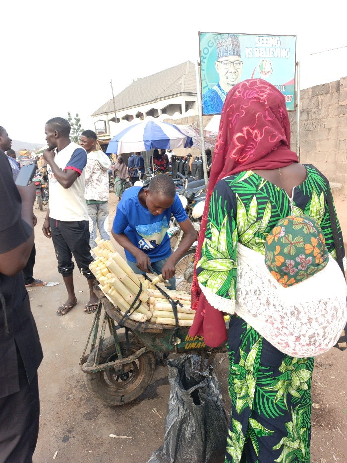 A street scene shows a vendor cutting sugarcane on a cart. The cart is overloaded with sugarcane stalks. A woman in a green and black patterned dress with a red headscarf stands nearby, carrying a baby in a sling on her back. Several other people are in the background, along with motorcycles and a political sign featuring a man in a suit and the phrase "Seeing is Believing." A black plastic bag sits on the ground near the cart.