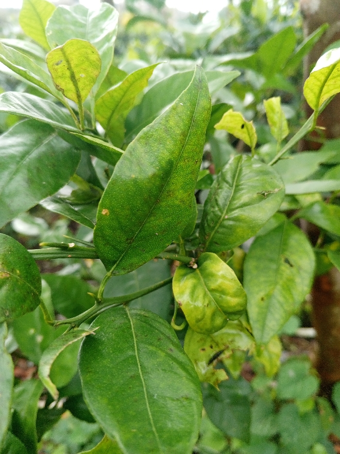 Close-up of a citrus plant branch with several leaves. The leaves are various shades of green, some vibrant and healthy, while others exhibit yellowing and discoloration. A few small thorns are visible along the branch. The background is blurred, indicating other foliage and possibly a tree trunk out of focus. The leaves display a textured surface with tiny spots.