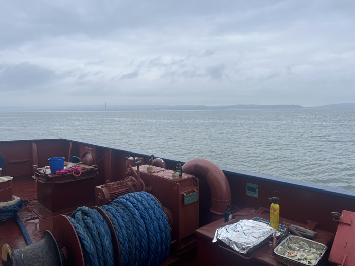 deck of a maroon-colored vessel at sea on an overcast day, likely in Belfast Lough, near Bangor, Northern Ireland