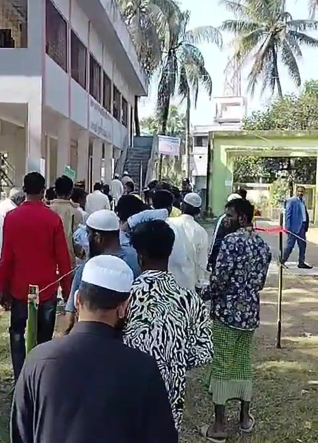 A group of people are lined up, likely waiting to enter a building. The line is guided by a rope strung between bamboo poles marked with red flags. Most of the people in the line are men, many wearing traditional Muslim caps. Some are wearing more casual clothing like shirts and jeans. One man looks at the camera and smiles. The area appears to be outdoors, possibly a courtyard, with palm trees visible in the background. The buildings in the background suggest a school or a similar institution. The video seems to be taken on a sunny day.