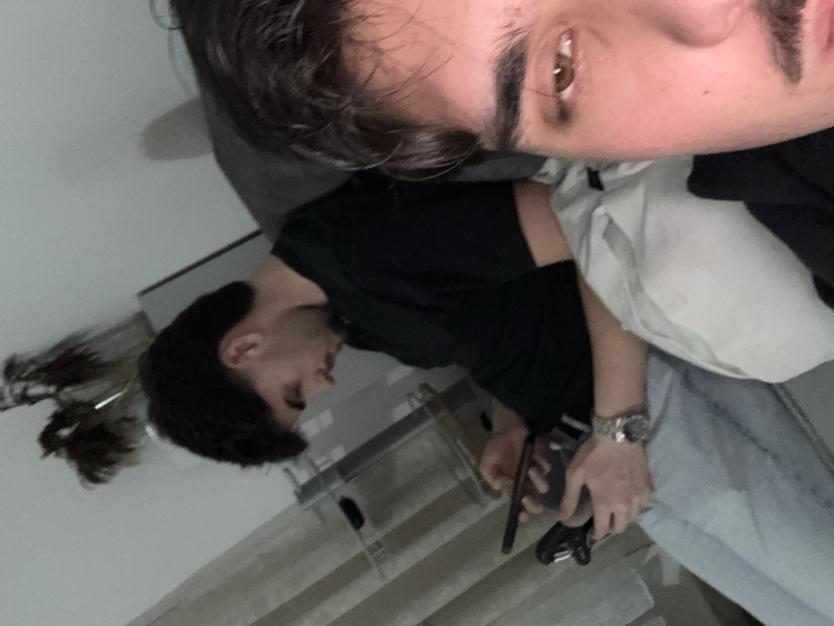 The image portrays an indoor setting with two male subjects. In the foreground, the right side of a male subject's face is partially visible, showing a brown eye, eyebrow, part of the nose, and a mustache. This individual has dark hair and appears to be oriented towards the camera. In the midground, a second male subject is seated in profile, facing left and looking downwards. He has dark hair with a distinct haircut (shorter on the sides, longer on top/back). He wears a dark, short-sleeved shirt and light-colored jeans. A metallic wristwatch with a link bracelet is present on his right wrist. He holds two smartphones; one dark-cased device is in his right hand, which he appears to be interacting with, while a second dark-cased phone is held below it in his left hand. He is seated on a dark grey sofa or cushioned surface, with a white pillow or blanket adjacent to him. The background features a light-colored wall, light-toned curtains on the left, and a tall, dark decorative plant on a surface above and behind the seated subject. A translucent storage container is visible below the plant. The scene is dimly lit, indicative of an interior low-light environment. The specific location within the city of Grad Rijeka, Croatia, cannot be visually confirmed from the provided image.