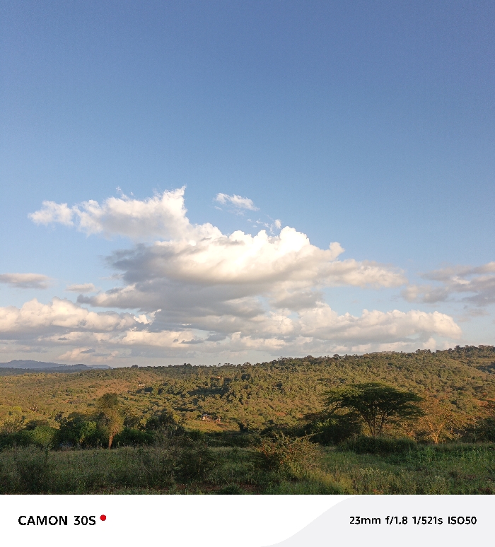 A landscape scene under a partly cloudy sky. Rolling hills covered in dense greenery dominate the middle ground. A few scattered trees are visible in the foreground with green grass. The sky is blue with white cumulus clouds, some shaded with grey. Distant mountains can be seen on the horizon. The photo's bottom features "CAMON 30S" and camera settings: "23mm f/1.8 1/521s ISO50".
