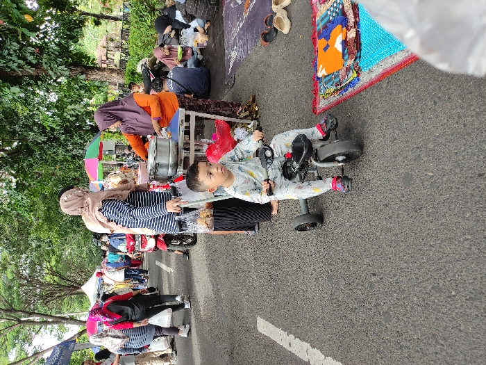 The scene takes place on a paved street in the city of Sidoarjo, Indonesia. The coordinates provided, -7.442 latitude and 112.705 longitude, correspond to a bustling street market in the city center. There are several people walking around, some with children, and a few vendors selling goods. In the foreground, a young boy with short black hair is riding a red and gray tricycle. He is wearing a white and gray patterned shirt, gray pants, and pink shoes. He is looking towards the right side of the image. Behind the boy, there is a woman wearing a hijab, a light brown striped shirt, and dark pants. She is carrying a shopping bag. The woman appears to be walking away from the camera and to the left side of the image. Behind her, there is a street vendor selling food from a cart. The vendor is a woman wearing a yellow hijab and a long, orange shirt. She is tending to a customer who is wearing a pink and black hijab. The vendor's cart contains several pots of steaming food and a variety of colorful plastic containers. Several people are sitting on the ground near the cart, including a man wearing a gray shirt, a woman wearing a light blue hijab, and another woman wearing a gray hijab. The scene is a mix of local life and business in Sidoarjo, Indonesia.