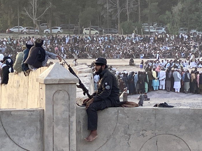 scene in Sard-E 'olya, Afghanistan, at the coordinates 31.716, 65.705. A large crowd of people are gathered in an open area, with many sitting on the ground. There is a man in a black uniform and a black cap, sitting on top of a concrete wall, holding a rifle. He appears to be guarding the crowd. There is also a group of men on the wall behind him, with one man in a black jacket and a white turban. The ground is dusty and there are several cars parked in the background. The image appears to have been taken during the day.