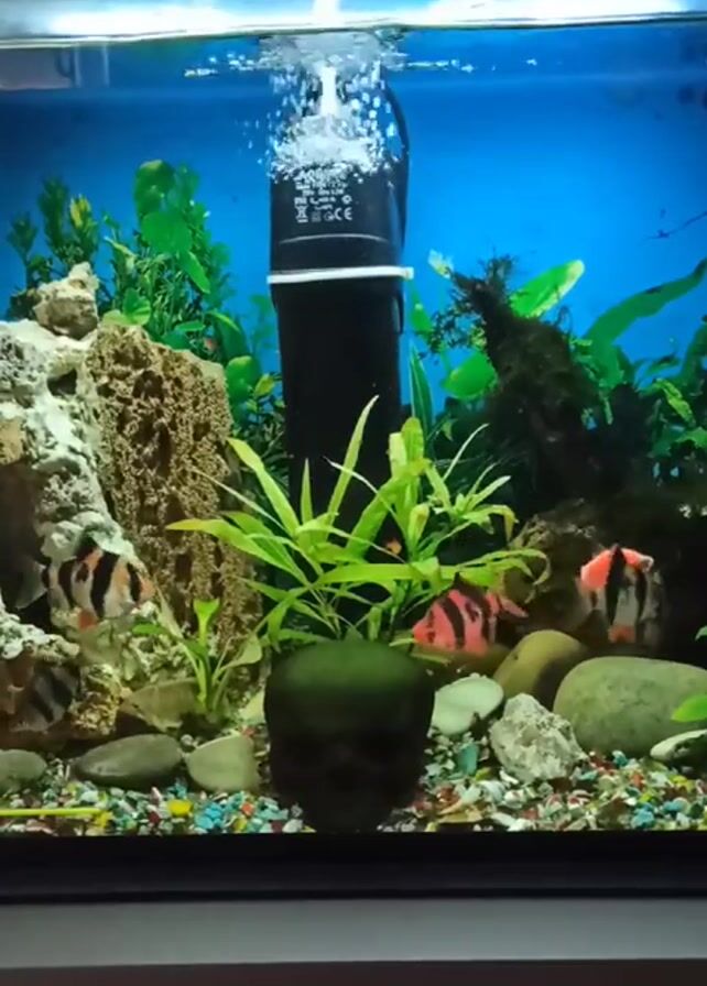 freshwater aquarium. Inside, there are several tiger barbs (small fish with black stripes and orange bodies) swimming among green plants, rocks, and a skull-shaped decorative item. A black filter system is positioned in the center of the tank, releasing bubbles at the top. The tank is filled with clear water and has a blue background. The gravel at the bottom is multi-colored.