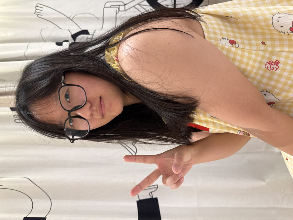 The scene is located in Daxing District, China, and depicts a young East Asian female in an indoor setting, captured from the chest up. She has long, dark, straight hair and wears black-framed, hexagonal glasses. Her facial expression is neutral. She is dressed in a sleeveless top with a yellow and white checkered pattern, featuring white cartoon cat-like figures and red symbols. Her left hand is raised to shoulder height, displaying a 'V' gesture with the index and middle fingers extended. The background consists of a light-colored curtain or fabric screen, detailed with black line art depicting abstract human body parts, specifically a hand and a foot, alongside other linear patterns.