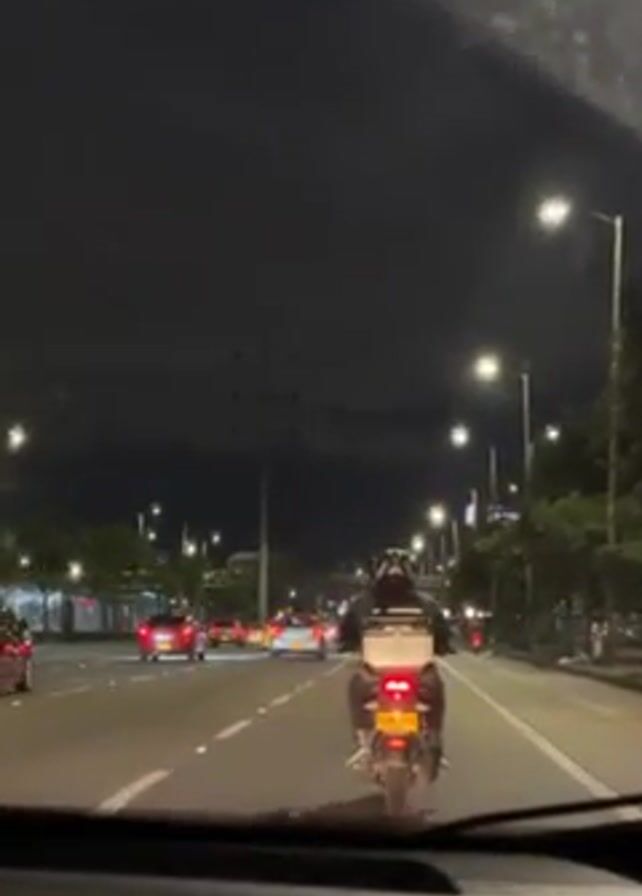 night time street scene from the inside of a car. Other vehicles are driving on the same street, including a motorcycle with a delivery box on the back, and a car with its lights flashing. Streetlights are present on both sides of the road. The weather appears to be clear.