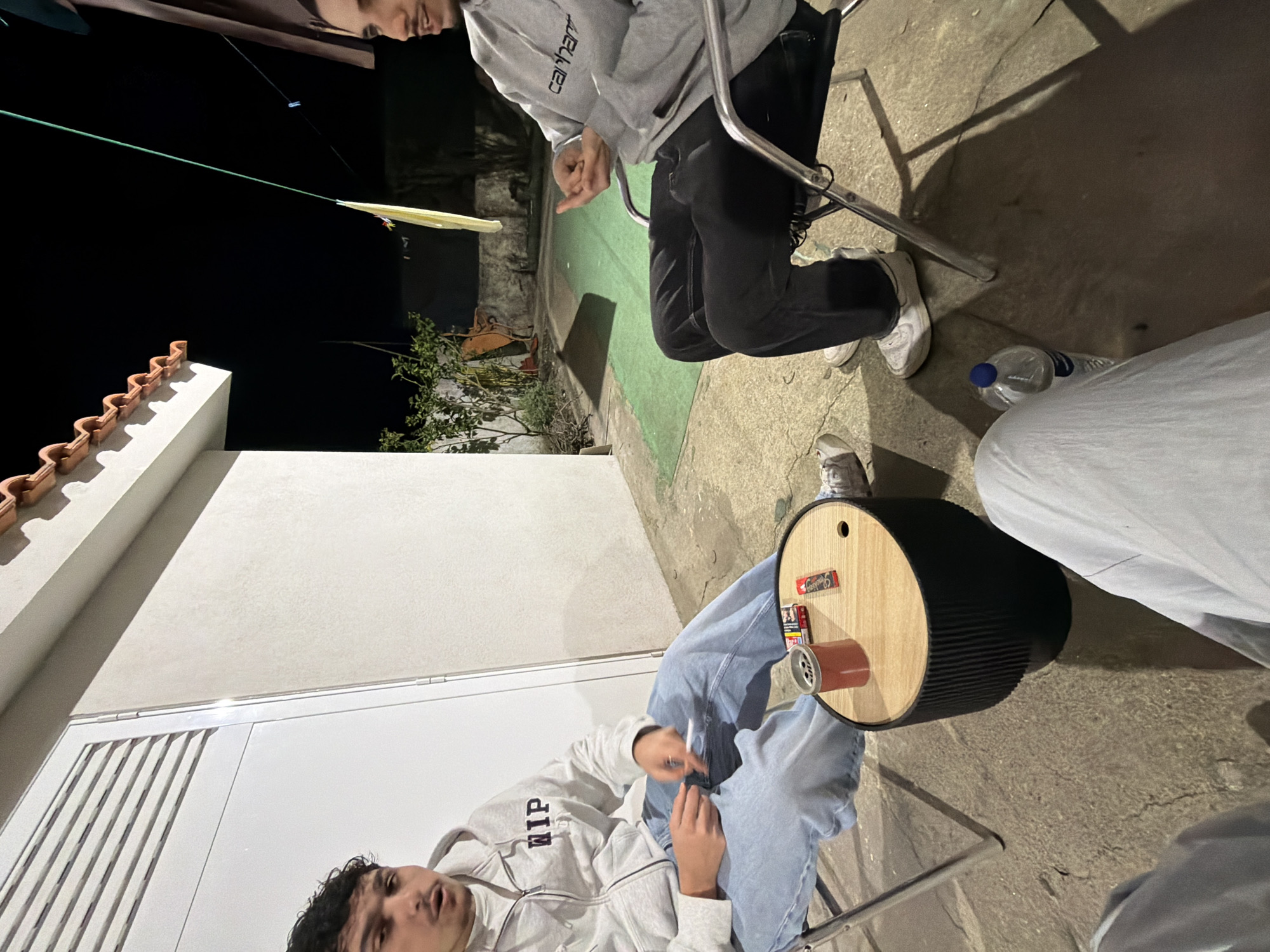 The image depicts an outdoor night scene in the city of Vila Real, Portugal, showing three males gathered on a concrete patio beside a building. In the foreground, the lower legs of a third individual, clad in light-colored trousers, are visible, with a plastic water bottle with a blue cap resting on the concrete floor nearby. To the left, a male subject with dark, curly hair and a mustache is seated on a silver-framed folding chair. He wears a light grey zippered hoodie with "WIP" text and light blue baggy jeans. His left hand holds a white cigarette. He faces towards the center of the frame, with his mouth slightly ajar. Behind him is a white wall featuring a louvered white door. Centered between the two visible seated individuals is a dark-ribbed cylindrical side table with a light wooden top. On the table, from left to right, are a red cylindrical ashtray with a metal insert, a red cigarette packet, and a red package of rolling papers. To the right, a second male subject, with short dark hair and facial hair, is seated on a similar silver-framed folding chair. He wears a light grey hooded sweatshirt with "Carhartt" text and dark trousers. His hands are raised and clasped in front of him, suggesting mid-conversation or gesturing. The background reveals a low wall, sparse green foliage, and a length of green rope suspended horizontally, from which a yellow garment hangs. A green turf mat is visible on the concrete ground beyond the seated figures. Overhead, a brown-tiled roof overhang is partially visible against a dark night sky. The scene is illuminated by an unseen artificial light source, casting shadows.
