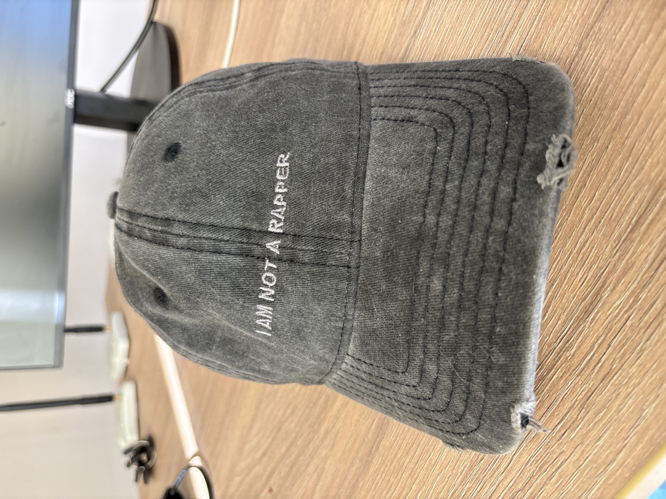 A distressed, dark grey baseball cap is centrally positioned on a light wooden desk surface in Зеленогорское сельское поселение, Ukraine. The cap features the embroidered white text "I AM NOT A RAPPER" across its front panel. The fabric exhibits a faded or stonewashed appearance, with visible fraying and minor tears along the edge of the brim. Two black ventilation eyelets are present on the upper crown. In the out-of-focus background, a black computer monitor stand is visible, alongside indistinct white and black electronic devices or cables on the desk. No people are present.