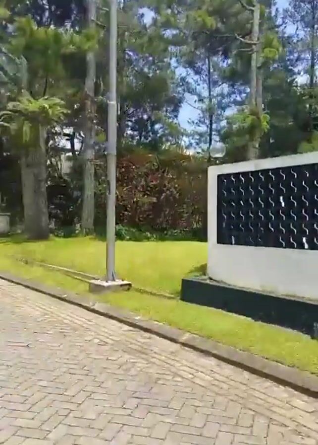 camera panning across a residential street paved with interlocking bricks. On the left, a low white wall with decorative black lattice panels runs alongside the road. Behind the wall, there's a grassy area and a line of tall pine trees against a blue sky with scattered white clouds. As the camera pans right, the scene shifts to a view of houses behind a concrete wall. Palm trees are dotted along the landscape. The final shot shows a multi-story house under construction. A street lamp is visible in the foreground.