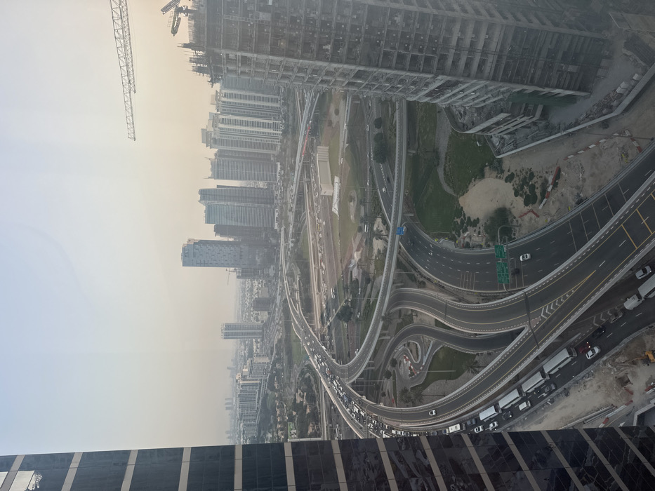 This image presents an elevated, wide-angle view of a complex urban landscape in Dubai, United Arab Emirates, specifically a multi-level highway interchange within the Business Bay district, likely looking towards Downtown Dubai or along Sheikh Zayed Road. The scene is dominated by an intricate network of elevated and ground-level roadways, ramps, and overpasses, creating a "spaghetti junction" effect. The atmospheric condition is hazy, with a light blue to faded yellow sky gradient visible above the cityscape. **Infrastructure and Environment:** * **Roads:** A primary focus is the extensive road infrastructure. Multiple lanes of traffic are visible on various levels. On the lower left, a multi-lane highway exhibits significant traffic congestion, with numerous buses and private vehicles appearing stationary or moving slowly. Other sections of the interchange show moderate to light vehicle presence. Road markings, including lane dividers and direction arrows, are discernible. Blue road signs are visible on elevated sections. * **Buildings:** The urban environment features a dense collection of modern high-rise buildings. Many are sleek, glass-clad structures, while others are still under construction. A prominent multi-story building, structurally complete but lacking exterior cladding, stands on the right side of the frame, revealing its internal framework. Construction materials are visible at its base. On the far left, a dark, glass-clad building with a distinct striped pattern occupies the foreground. In the mid-ground and distance, numerous completed high-rises contribute to the skyline. * **Construction:** Evidence of ongoing construction is prevalent. Besides the partially completed building on the right, a large tower crane is visible in the upper mid-right, and another crane arm extends from behind distant buildings in the upper left. Ground-level construction sites with exposed earth, sand, and building materials are present between road sections and around the bases of new structures. A yellow excavator-like vehicle is visible in the lower left construction area. * **Green Spaces:** Interspersed between the roads and construction zones are patches of green space, featuring grass, scattered shrubs, and a few small trees, providing a contrast to the grey concrete and asphalt. A larger irregularly shaped green area with a sandy patch runs beneath the elevated roads in the mid-right. **Subjects and Objects:** * **Vehicles:** Numerous vehicles, primarily cars, vans, and a significant number of buses, are observed on the roads. They are either in motion or part of congested traffic queues. No individual persons are discernible from this elevated distance. * **Construction Equipment:** Cranes and what appears to be an excavator. * **Road Signage:** Blue overhead road signs with white text are visible. The scene depicts a dynamic and expanding urban center characterized by extensive modern infrastructure and continuous development.