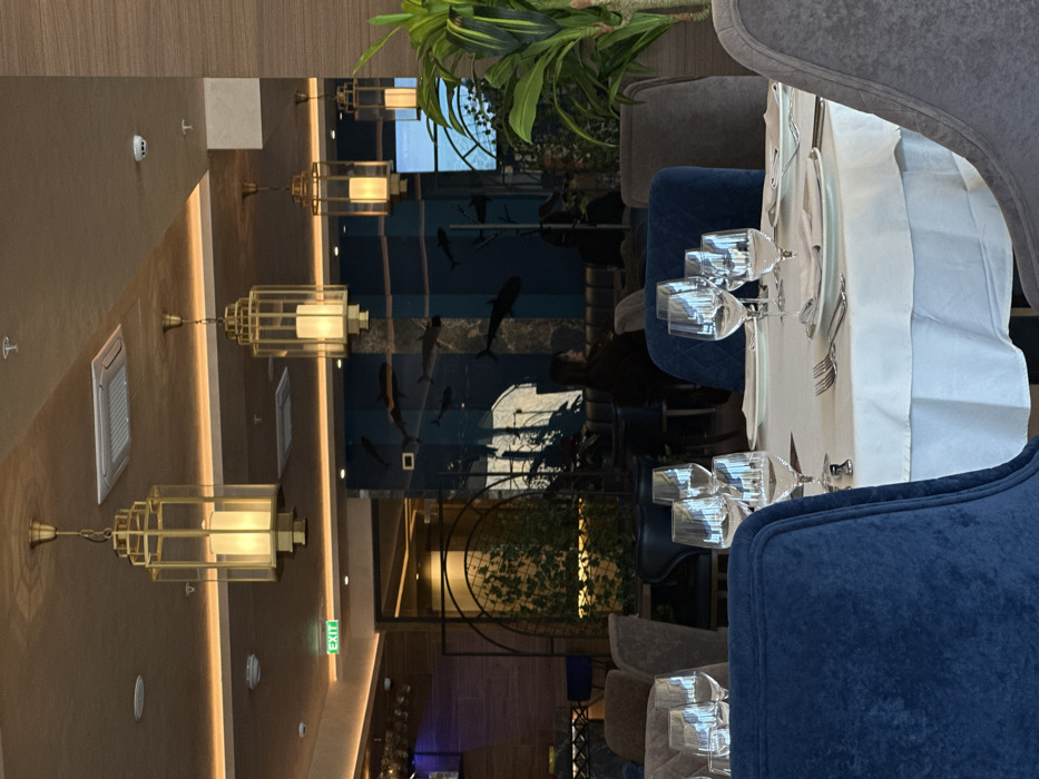 This image depicts the interior of a restaurant in Orahovo, Montenegro. In the foreground, a white-linened dining table is set with multiple clear stemmed wine glasses, white plates, and silverware. Several dark blue velvet upholstered chairs are visible around this table, along with grey upholstered chairs to the right. The midground features additional dining tables and chairs. One individual, a female with dark hair, is seated at a table further back, facing away from the camera, dressed in dark attire. The decor includes multiple illuminated gold-colored, lantern-style pendant lights suspended from the light brown ceiling, which also features recessed lighting and air conditioning vents. A prominent blue wall section with numerous dark fish silhouettes is visible, creating an aquatic theme. To the left, a large arched metal frame encloses green foliage. A bright green "EXIT" sign is affixed to a wall in the upper left background. A large green potted plant is situated on the right side of the frame.