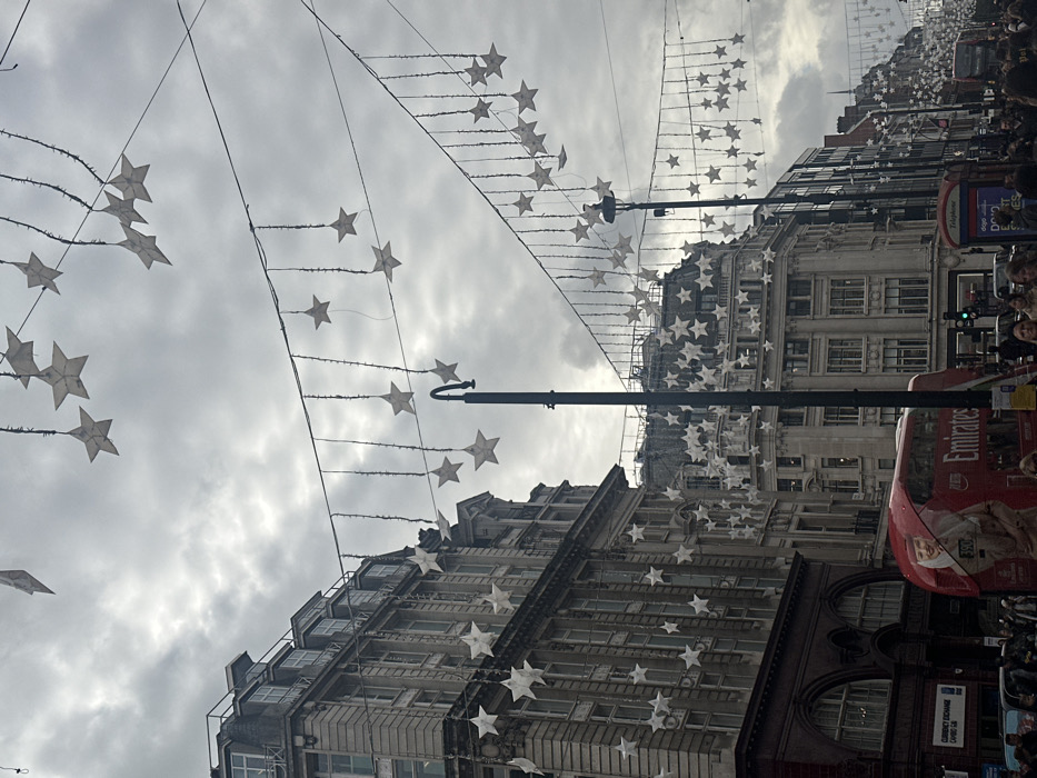 The image depicts a busy urban street scene in central London, United Kingdom, specifically Regent Street near Piccadilly Circus. The sky is uniformly overcast and grey, indicating heavy cloud cover. Numerous white, five-pointed star-shaped decorations are suspended overhead across the street by visible wires, hanging at varying lengths. Many of these stars appear illuminated, suggesting they are part of a festive light display. On the left, a multi-story, ornate stone building with numerous windows dominates the immediate foreground. Its lower section features a distinctive dark reddish-brown facade with arched windows, characteristic of a London Underground station entrance (Piccadilly Circus). A "CURRENCY EXCHANGE" sign is partially visible on the ground level of this building. In the mid-ground, a red double-decker bus, displaying an "Emirates" advertisement, travels leftward. Dark lampposts or utility poles are positioned vertically within the frame. On the right side of the street, a red telephone box is partially visible. The pavements on both sides of the street are occupied by numerous pedestrians, indicating a busy thoroughfare. Additional buildings line the street, extending into the distance, also adorned with similar star decorations on their facades. Other vehicles are visible further down the street.