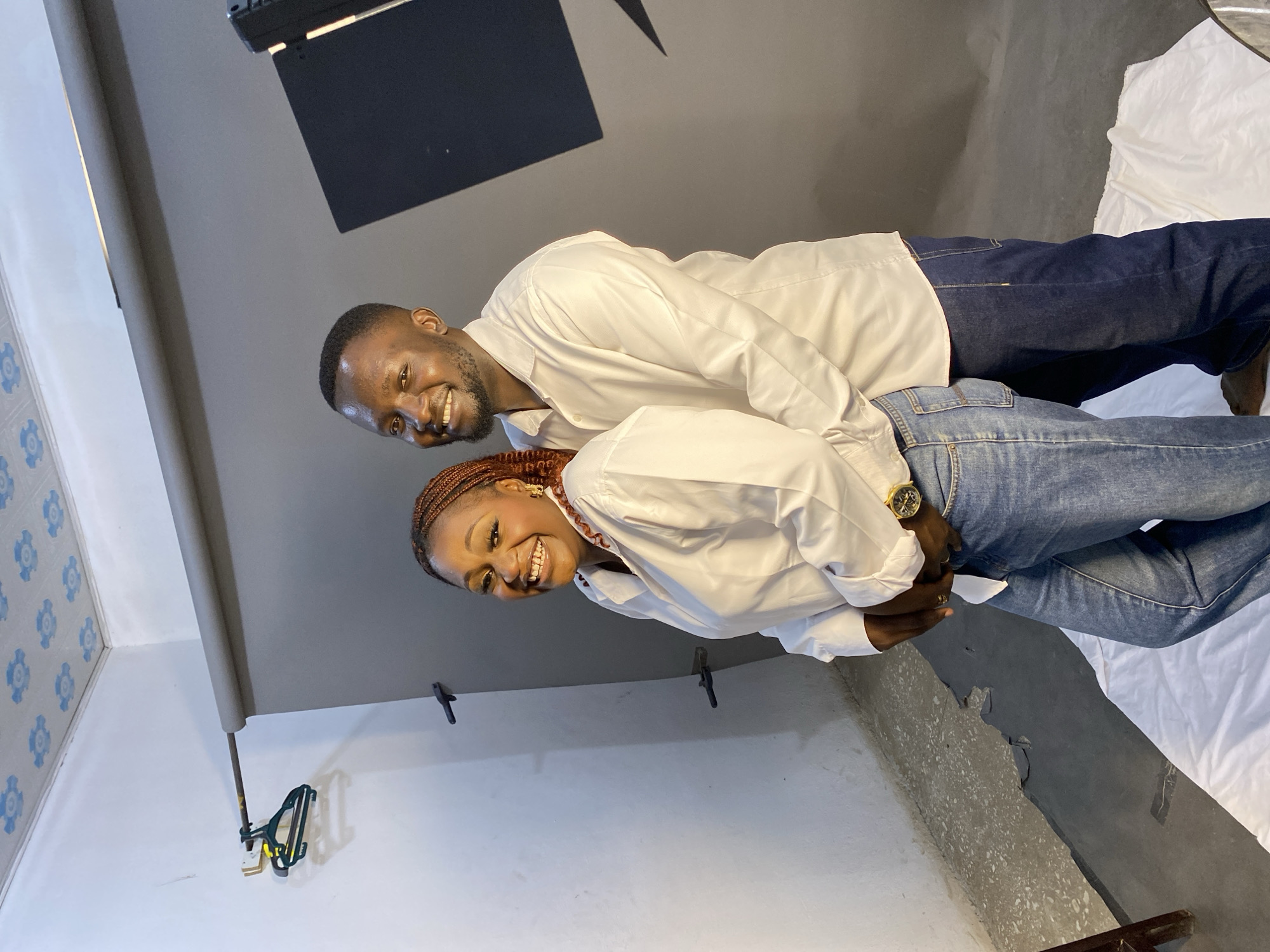 An indoor studio portrait depicts two individuals, a man and a woman, embracing and smiling directly at the camera. The woman, positioned slightly left and forward, has dark skin, braided reddish-brown hair, and wears a white long-sleeved collared shirt, blue denim jeans, gold earrings, and a gold-toned watch on her left wrist. The man, standing behind her, has dark skin, short dark hair, a trimmed beard, and wears a white long-sleeved collared shirt and dark blue denim jeans; his arms are wrapped around the woman's waist. The background primarily consists of a grey seamless photographic backdrop. To the left of the backdrop, a white wall with some discoloration is visible, featuring a horizontal metal rod with a green plastic hanger. Two black clamps are attached to the grey backdrop. The floor is a rough concrete surface, partially covered by a rumpled white sheet or fabric where the subjects are standing. A portion of a dark studio lighting panel is visible on the far right edge of the frame. The ceiling in the upper left corner is white with a repeating blue floral pattern. The setting is consistent with a commercial photo studio within the city of Jos, Nigeria.