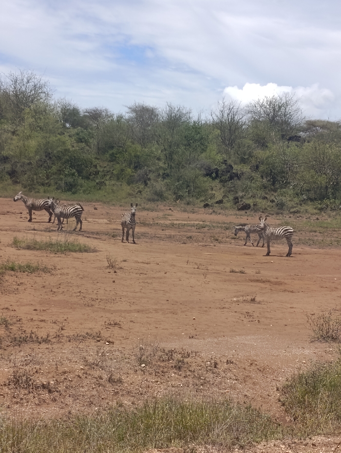 The image depicts a group of five zebras standing in a dry, dusty field near Mtito Andei, Kenya