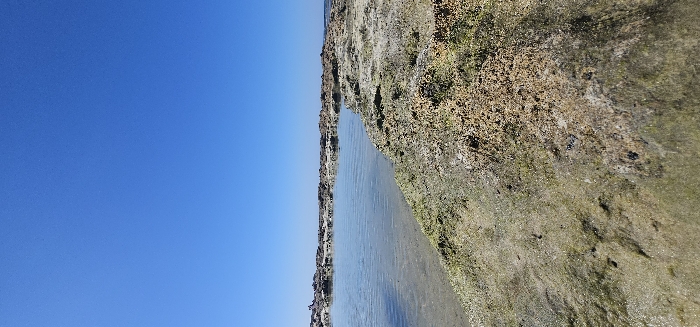 This image displays a natural coastal landscape, situated within the Palmachim area of Israel. The upper half of the frame is dominated by a clear, cloudless, deep blue sky. Below the sky, on the left side, is a calm, shallow body of water, likely a tide pool or an inlet, presenting a light blue-green tint and reflecting the sky's color. The immediate foreground and right side of the image consist of a rugged, uneven rocky shoreline. These rocks are light brown and gray in color, extensively covered with patches of vivid green algae and reddish-brown organic deposits. Further rocky formations are visible across the water in the middle ground, extending towards the distant horizon. No people, animals, man-made objects, or specific actions are discernible within the frame. The scene is illuminated by direct sunlight.