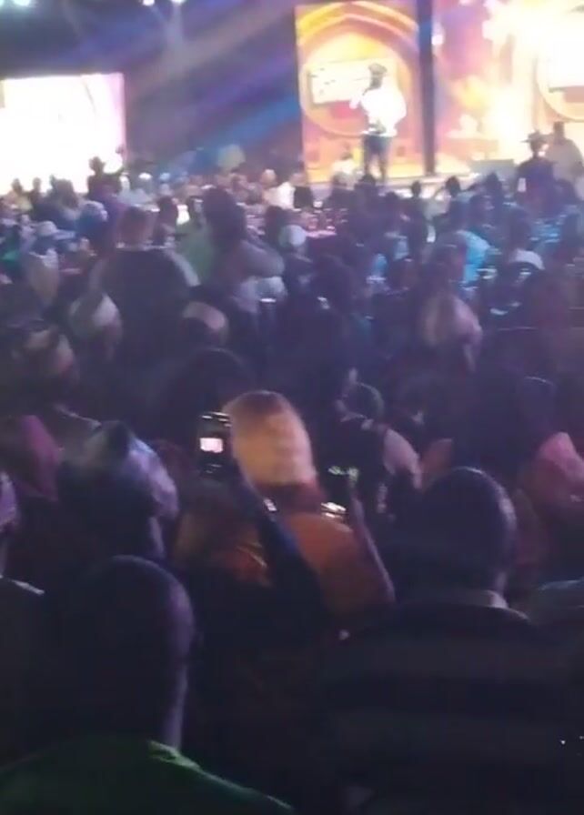 large crowd of people gathered in a dimly lit indoor space, likely an auditorium or concert hall. A stage with large screens and lighting is visible in the background, where a figure appears to be performing or speaking. Many individuals in the crowd are holding up their phones, presumably recording the event. The camera moves slightly, offering different perspectives of the crowd and the stage. The lighting is colorful, with beams shining down from the stage.