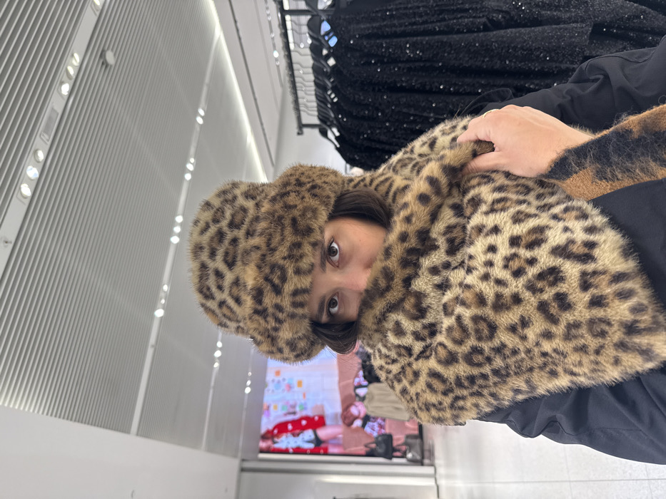 A person is depicted in a close-up, upper-body shot, centered within an indoor retail environment. The individual has dark hair and is wearing a leopard-print faux fur bucket hat and a matching faux fur scarf or shawl. The scarf is pulled upward, covering the lower half of the face and revealing only the eyes and the upper bridge of the nose. A dark-colored jacket or coat is visible beneath the scarf. The person's right hand is raised, grasping the scarf near their left shoulder. The subject is looking directly towards the camera. The background shows a brightly lit, contemporary clothing store. To the right of the person, a metal clothing rack displays multiple dark, possibly sequined, garments. To the left, a large, vertically oriented digital screen or illuminated display panel showcases a model or mannequin wearing a red jacket with white heart patterns, a white inner garment, and dark bottoms. Other retail items, including handbags, are partially visible on display further in the background to the left. The ceiling is white with multiple linear and recessed circular light fixtures. The floor is light-colored and reflective. The architectural style and retail presentation, particularly the lighting and display characteristics, are consistent with a Zara retail establishment. Therefore, the scene is located within a Zara store, most plausibly the one situated in the Promenada Novi Sad shopping center, Novi Sad, Serbia.